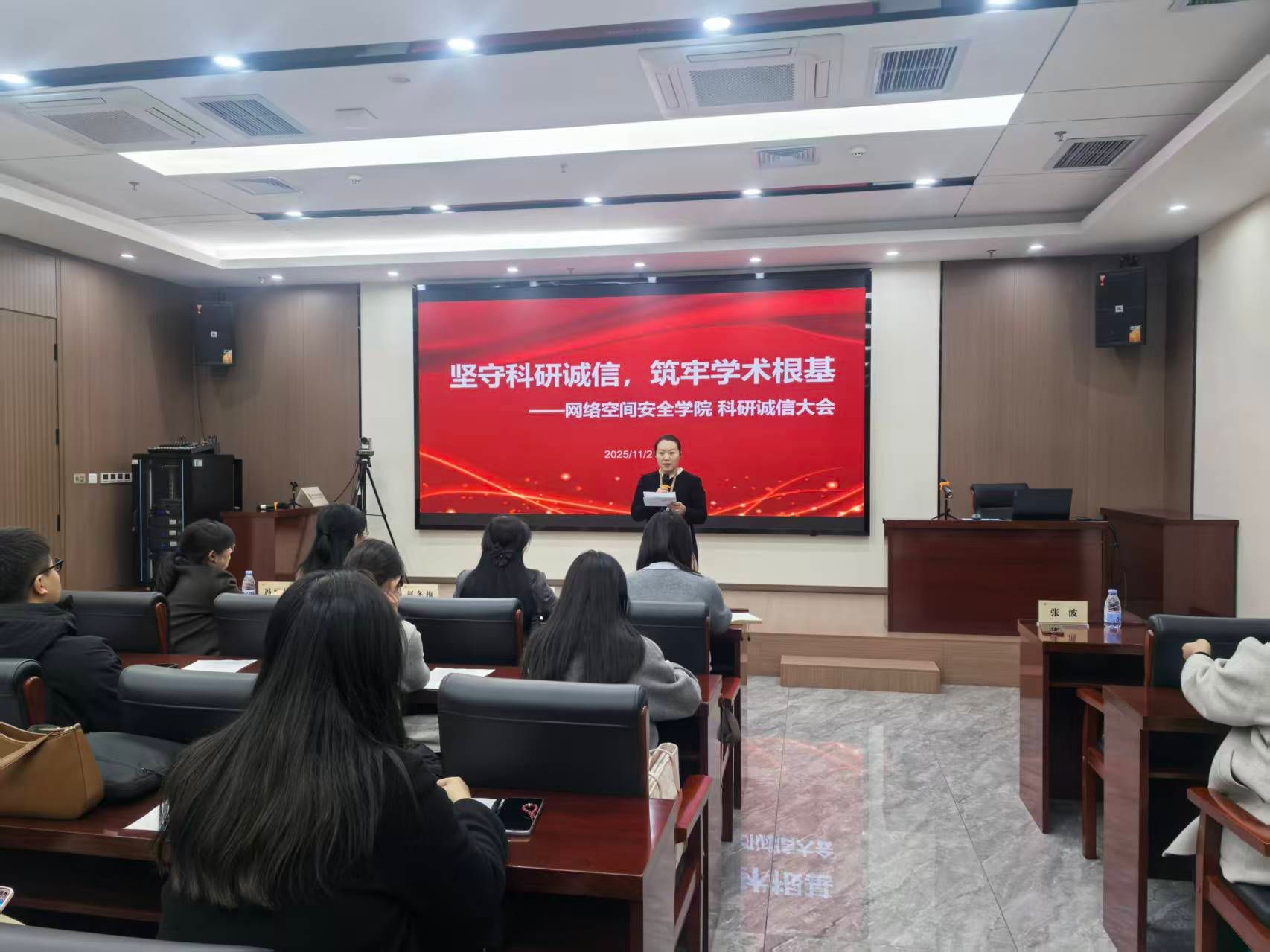 为进一步加强学院科研诚信建设,规范学术行为,营造风清气正的科研环境,2025年11月21日下午,网络空间安全学院在图书馆第一会议室隆重召开“坚守科研诚信,筑牢学术根基”科研诚信大会。科研与产教融合处处长王素贞教授、学院院长赵冬梅教授、学院党总支书记兼学管副院长樊风彩、学院教学副院长冯丽佳出席会议,学院全体教师参会。