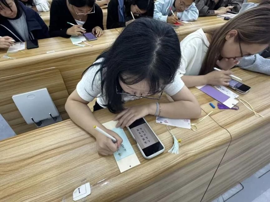 主持人详细介绍活动背景、规则与流程,让参与者对活动有清晰认知。参与者领取空白书签和绘画工具后,大家或单人静心创作,或结对交流灵感,现场氛围热烈且充满创意。在创作过程中,同学们围绕“爱国”主题自由发挥,有的手绘国旗、国徽等国家象征,一笔一画间尽显对国家标志的敬重与热爱;有的描绘革命历史场景,仿佛将那段峥嵘岁月重现于书签之上,表达对革命先辈的缅怀与崇敬;有的展现时代发展成就,用色彩与线条勾勒出国家繁荣昌盛的模样;还有的绘制心中的爱国人物,搭配爱国诗句、短句,让书签成为爱国情感的载体。活动不设技法限制,鼓励同学们用丹青笔墨表达“赤心”,无论是细腻工笔还是简约速写,只要能传递爱国情感即可。创作过程中,同学们互相借鉴创意,自由交流想法,思维的碰撞让现场创意不断迸发。