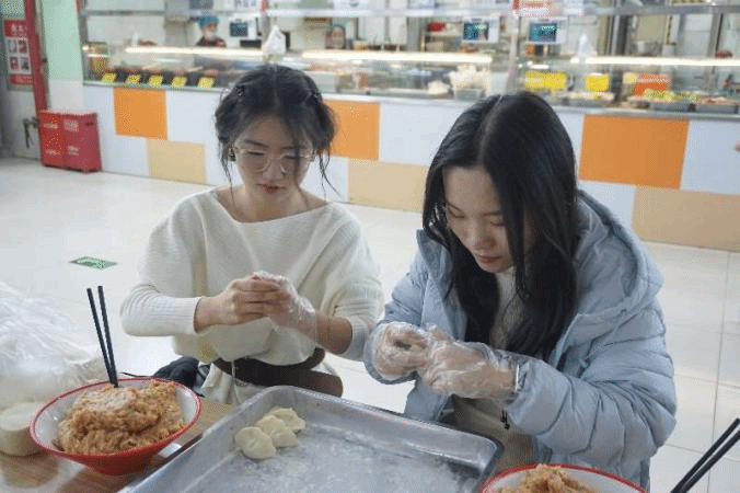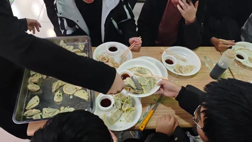 活动现场暖意融融,提前备好的饺子皮、玉米鲜肉馅料、韭菜鸡蛋馅料及相关工具已整齐摆放到位。同学们双手拉伸按压饺子皮,使面皮逐渐变得光滑筋道,大家舀取心仪馅料置于饺子皮中央,随后用手指沿皮边轻轻捏合,部分手法娴熟的同学还能快速捏出均匀的褶皱,确保饺子造型饱满、不易露馅。现场虽无过多喧哗,却充满专注有序而热闹非凡的氛围,同学们舀馅、填馅、压实的动作精准利落,默契配合,在互动交流中感受冬至节气的传统韵味与集体温暖,指尖的忙碌与食材的鲜香交织,尽显青春群体参与传统活动的活力与热忱,随后大家围坐在一起品尝自己亲手包的饺子,汤汁鲜香、面皮劲道,每一口都饱含着劳动的喜悦与集体的温暖。