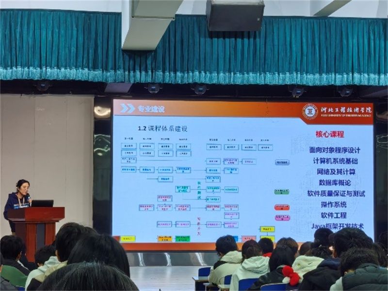 在产教融合人才培养模式方面,系主任给学生们介绍了本系的师资结构,展示了软件工程系的课程体系,明确强调本专业已与多家企业建立合作关系,采用校企共育模式,推行 “企业导师 + 校内导师” 双导师制,将企业真实项目融入课堂教学,学生可通过综合实践、理实一体等课程,提前积累行业经验。在社会服务方面,介绍了专业师生团队近年来的成果,学生就业面向京津冀,辐射全国,既提升了师生实践能力,也为区域经济发展贡献了专业力量。针对毕业条件,明确阐述了学分修读、实践考核、毕业设计(论文)等核心指标,完整介绍了完成毕业的各项要求。最后,为助力学生参与学科竞赛,系主任详细解读了本系的两个工作室:其中“梦启工作室”主要培养程序设计方面的特长,“界跃工作室”主要培养前端开发方面的特长。工作室均配备专职指导教师,提供固定场地与设备支持,通过 “以赛促学、以赛促练” 模式,组织学生参与 “挑战杯”“蓝桥杯” 等各级赛事。